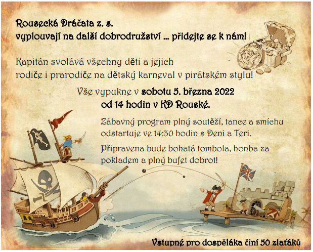 Dětský karneval v pirátském stylu v sobotu 5.3. od 14h na sále KD Rouské