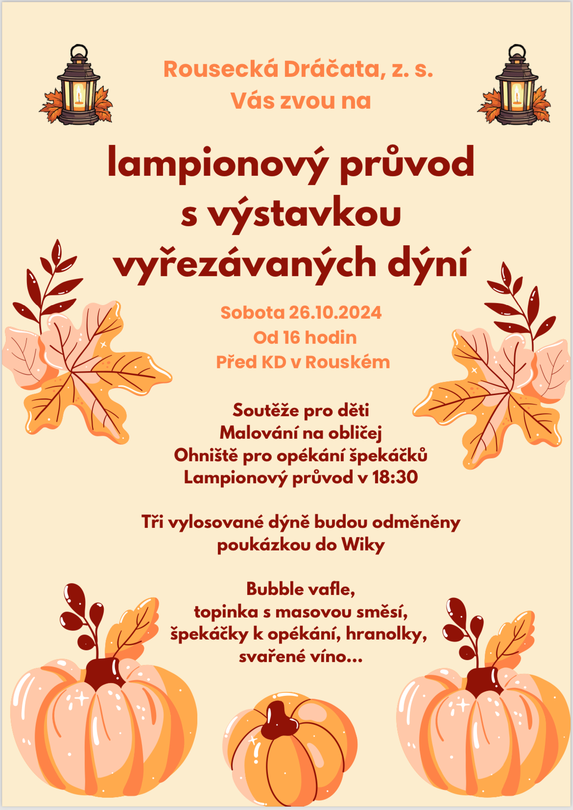 V sobotu 26.10. 2024 od 16h před KD Rouské, soutěže, malování na obličej, špekáčky a lampionový průvod v 18:30.